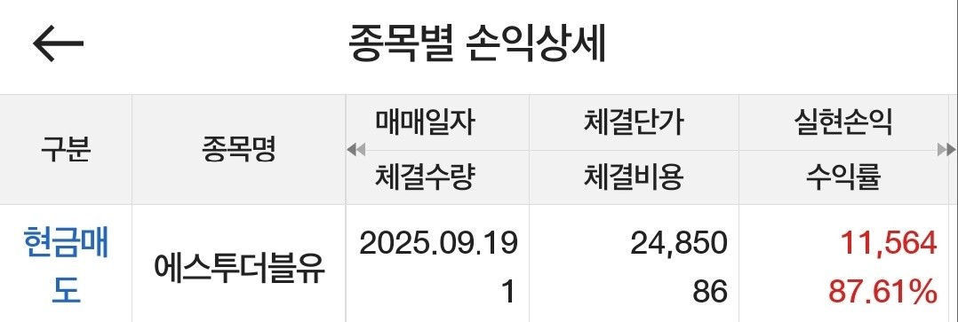 에스투더블유는 최초 상장가(공모가)는 1만 3200원이었고 저는 24,850원일때 매도하였습니다. 실현 손익 11,564원, 수익률 87.61%였습니다.