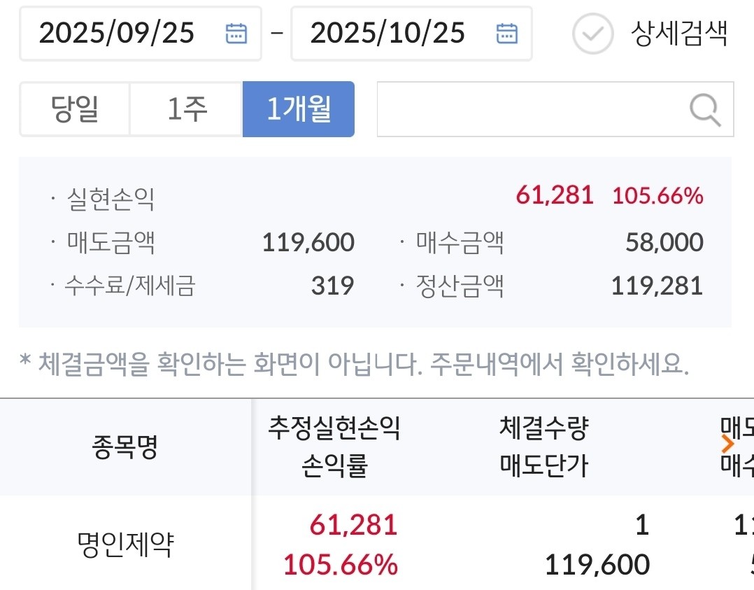 명인제약은 최초 상장가(공모가)는 58,000원이었으며 119,600원일 때 매도하여 실현 손익 61,281원(수수료 제외), 수익률 105.66%였습니다.
