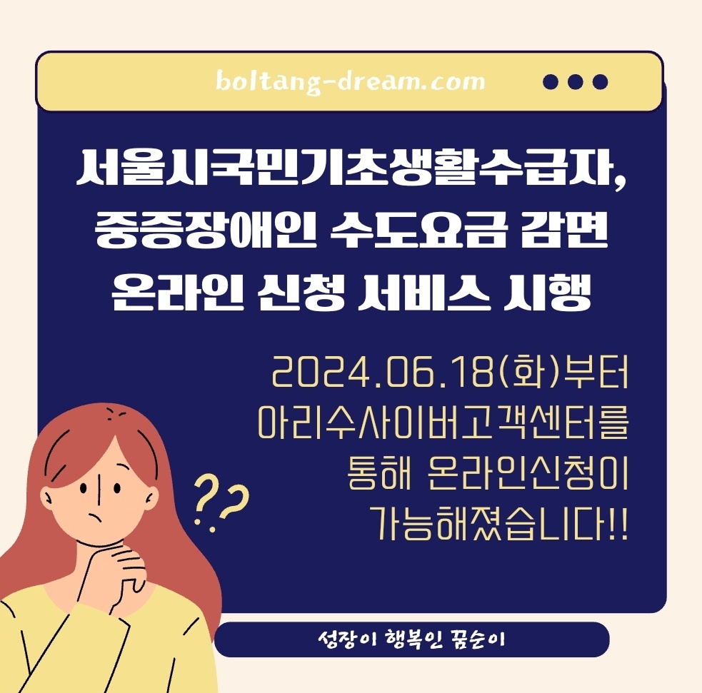 이처럼 2024년 6월 18일 화요일부터 서울시에 거주하는 국민기초생활수급자와 중증장애인의 수도요금 감면 온라인 신청서비스가 개시되었으니 집에서 편하게 수도요금감면 신청을 서두르시길 바랍니다.