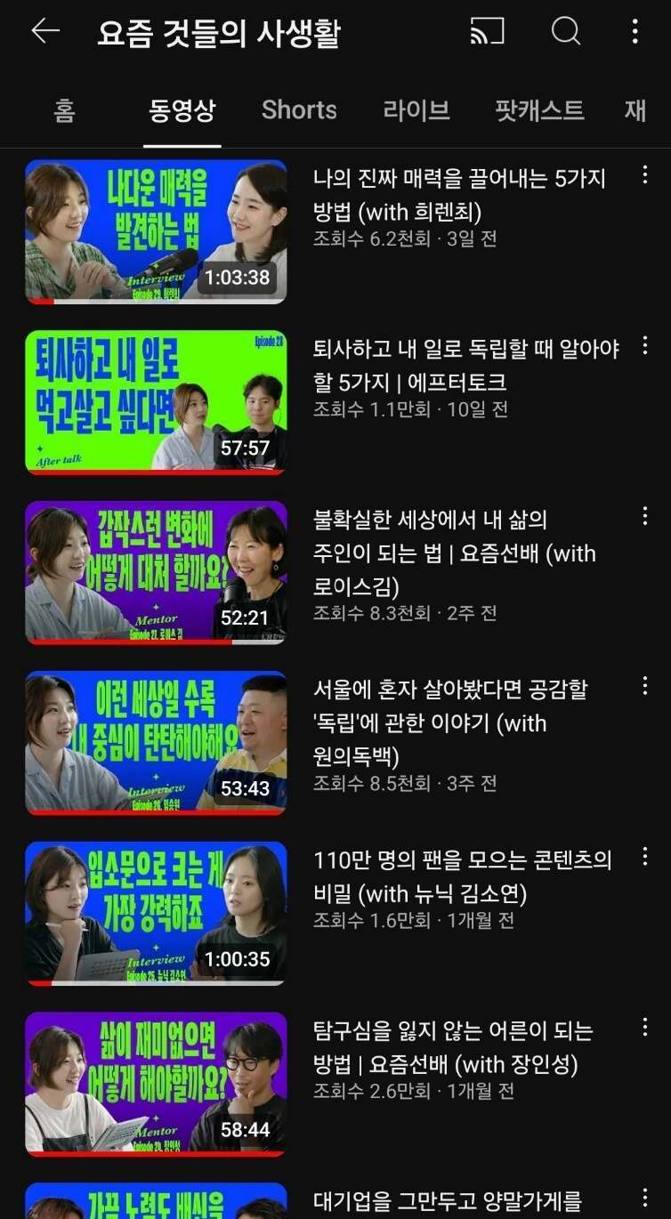 집안일 할 때, 누워서 자기전, 샤워할 때, 눈감고 어디론가 이동할 때 등등 귀로만 듣고 싶을 때가 많습니다. 가만히 눈을 감고 듣고 싶을 때도 많습니다. 이럴때 듣기 좋은 유투브영상이 있어 소개드리려고 합니다. 바로 '요즘사(요즘 것들의 사생활)'입니다.