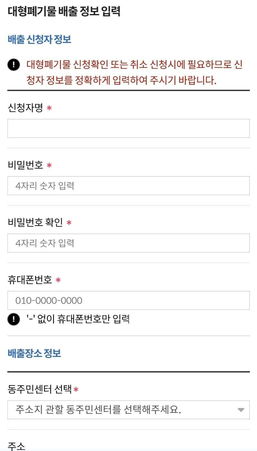'대형폐기물 배출 신청' 바로가기를 클릭하신 후 대형폐기물 배출 정보를 입력합니다. 신청자명, 비밀번호, 비밀번호확인, 휴대폰번호, 동주민센터 선택, 주소, 배출위치상세설명, 배출예정일을 순서대로 빠짐없이 기입합니다.