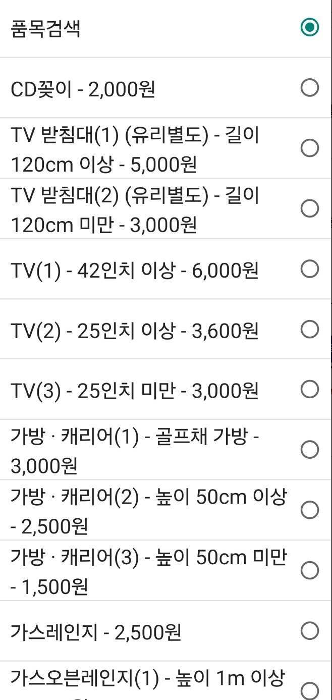 3. 배출품목을 선택합니다. 품목과 무게별로 단가가 다르니 해당되는 품목을 찾아 선택을 하시길 바랍니다.