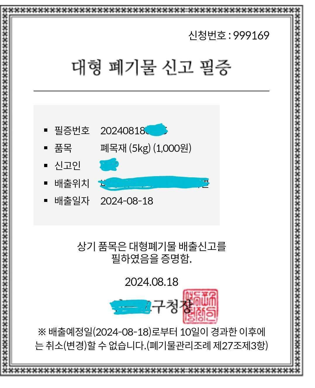 프린터로 인쇄하셔도 되지만 인쇄를 하지 못할 경우 빈 종이에 필증번호, 품목, 가격, 배출일자를 적어 대형폐기물에 부착 후 배출키로 한 장소에 갖다놓으시면 됩니다.