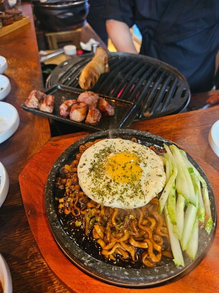 고기만 먹고 끝내려고 했으나 곁들임 메뉴목록을 보는 순간 하나는 먹어야 겠더라고요. 수제 비빔라면 하나를 주문했고 사장님은 불짜장라면이 맛있다며 추천해주더라고요. 추천메뉴는 다음에 먹자라는 생각으로 일단 저희가 먹고 싶은 수제 비빔라면을 주문했습니다. 참기름이 들어가 고소하고 감칠맛 도는 맛이었습니다. 다른 곁들임 메뉴도 하나씩 다 먹어보고 싶더라고요!