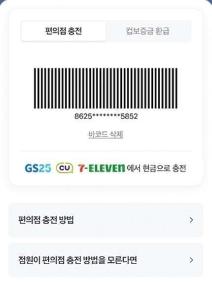 ① 교환할 동전을 들고 가까운 편의점에 방문합니다. 이때 바코드 충전이 가능한 편의점은 CU, GS25, 세븐 일레븐입니다.