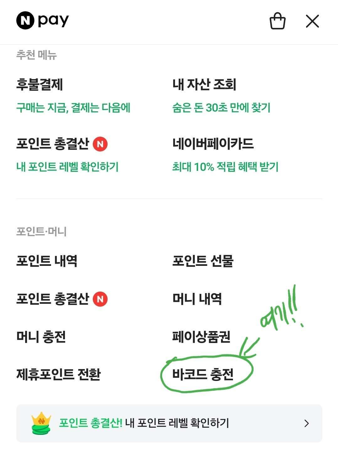 1. 네이버 페이의 바코드 충전 기능을 활용하세요!