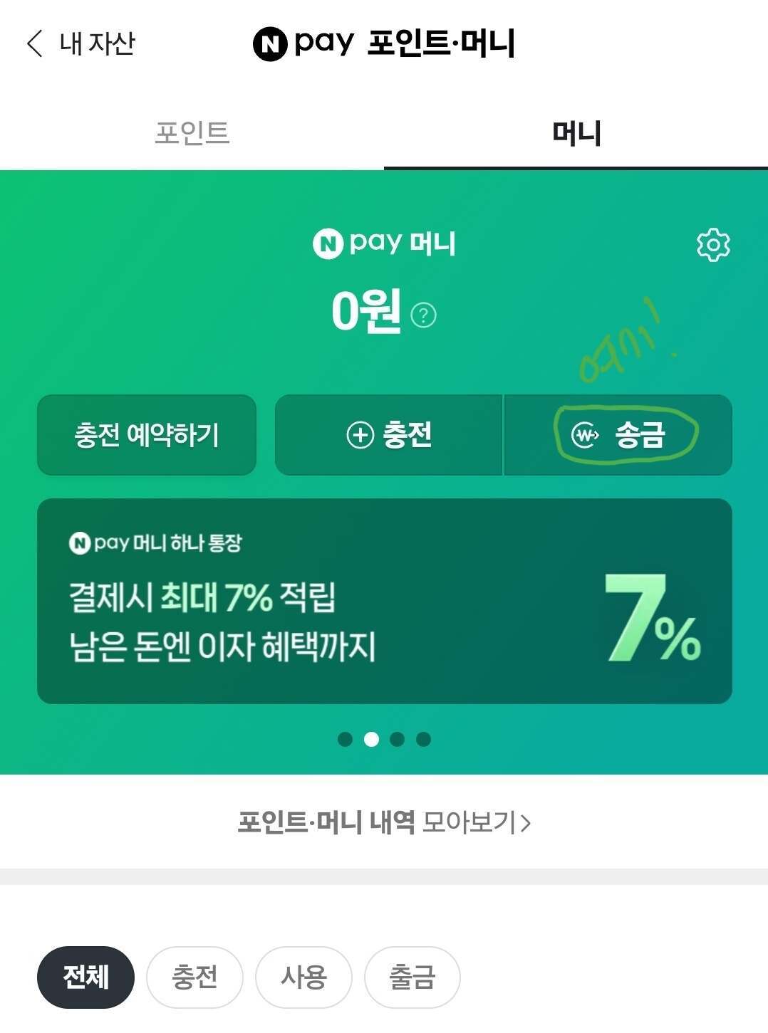 ⑤ 충전이 잘 되었다면 네이버 머니 메뉴에서 송금으로 내 계좌에 송금하면 깔끔하게 교환이 끝나게 됩니다.