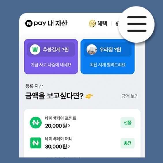 ② 편의점 방문자는 네이버 앱을 실행하고 네이버 페이 메뉴로 접속합니다. 우측 상단의 삼선(≡)메뉴로 들어갑니다.