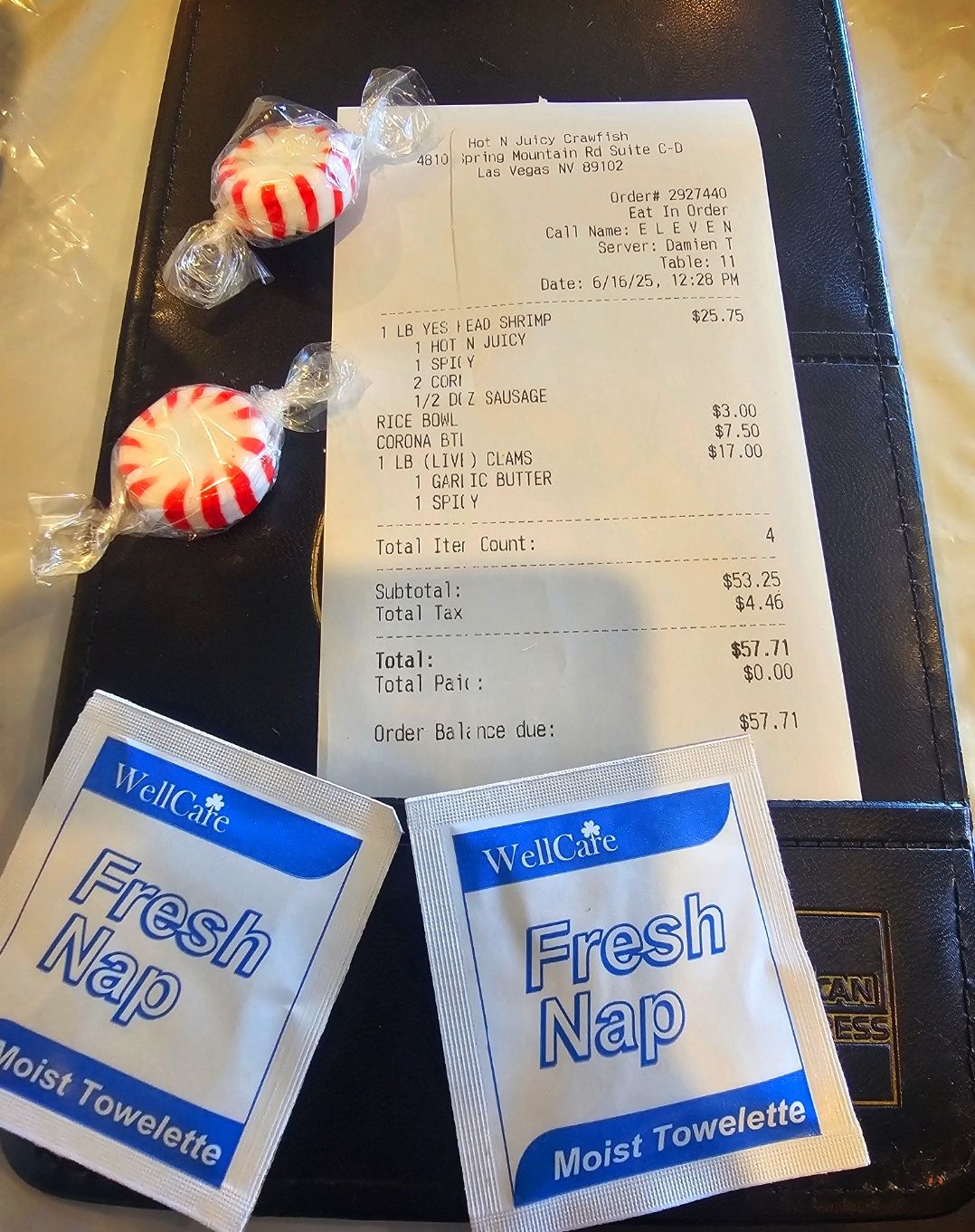 두명이서 방문했고 총 57.71달러(한화 8만 199.59원) 나왔습니다. 메뉴는 쉬림프와 조개, 콘 2개, 밥, 코로나 맥주 1병 이렇게 주문했습니다. 만족감이 높은 저녁식사메뉴였습니다.