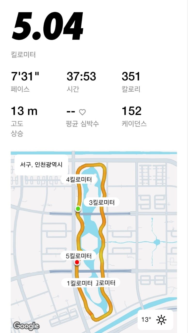 만약 청라호수공원의 길이가 10km만 되도 뛰는 것에 고민이 됐을 것 같습니다. 그런데 한바퀴 길이가 약 4.3km이기에 충분히 도전해볼 수 있겠다?라는 생각이 들었고 한바퀴를 완성했기에 그만큼 쾌감과 성취감이 컸습니다. 뛰다보니 출발지점을 약간 넘어서 5km를 채우고 왔습니다.