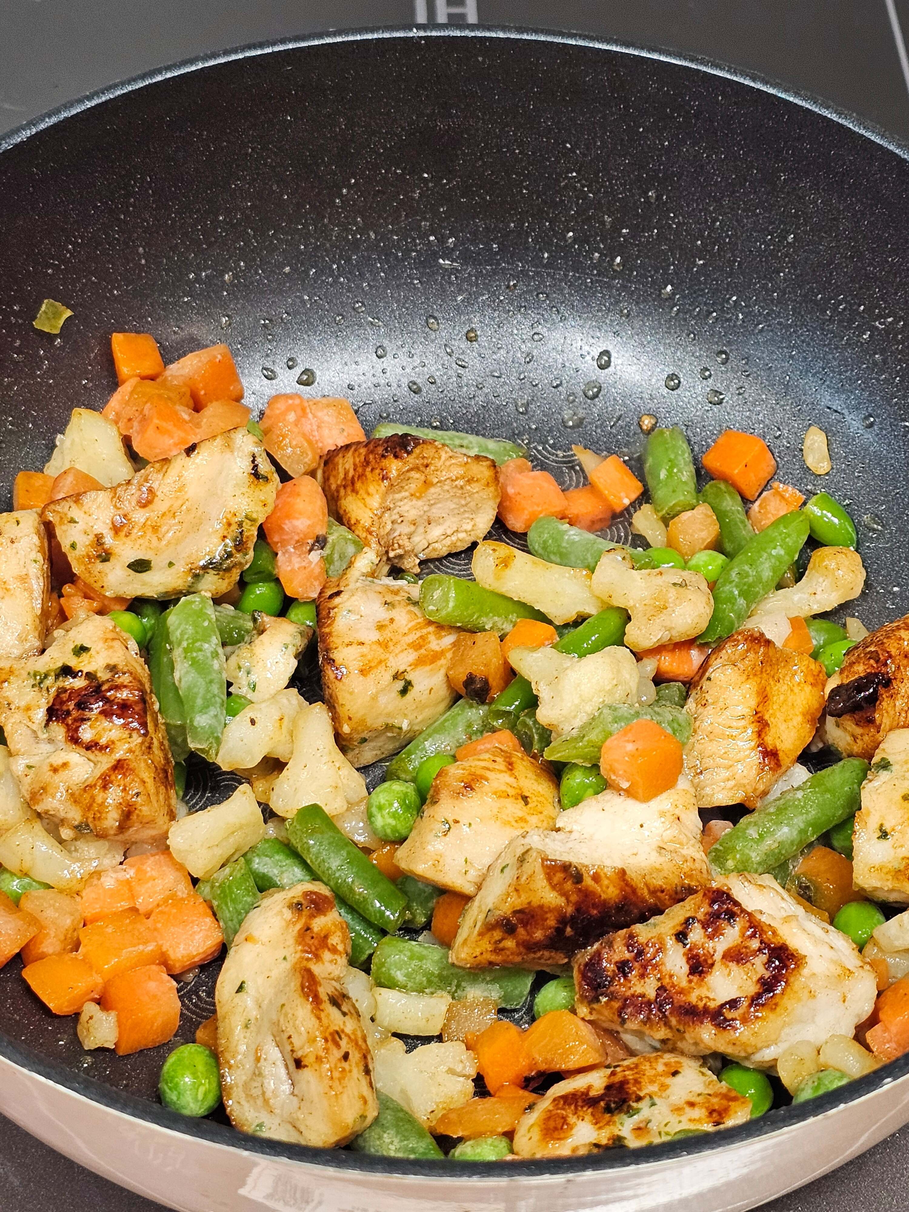 닭가슴살이 다 익어갈 때즈음 채소를 추가해보세요! 더 맛있고 건강한 식사를 즐길 수있습니다.