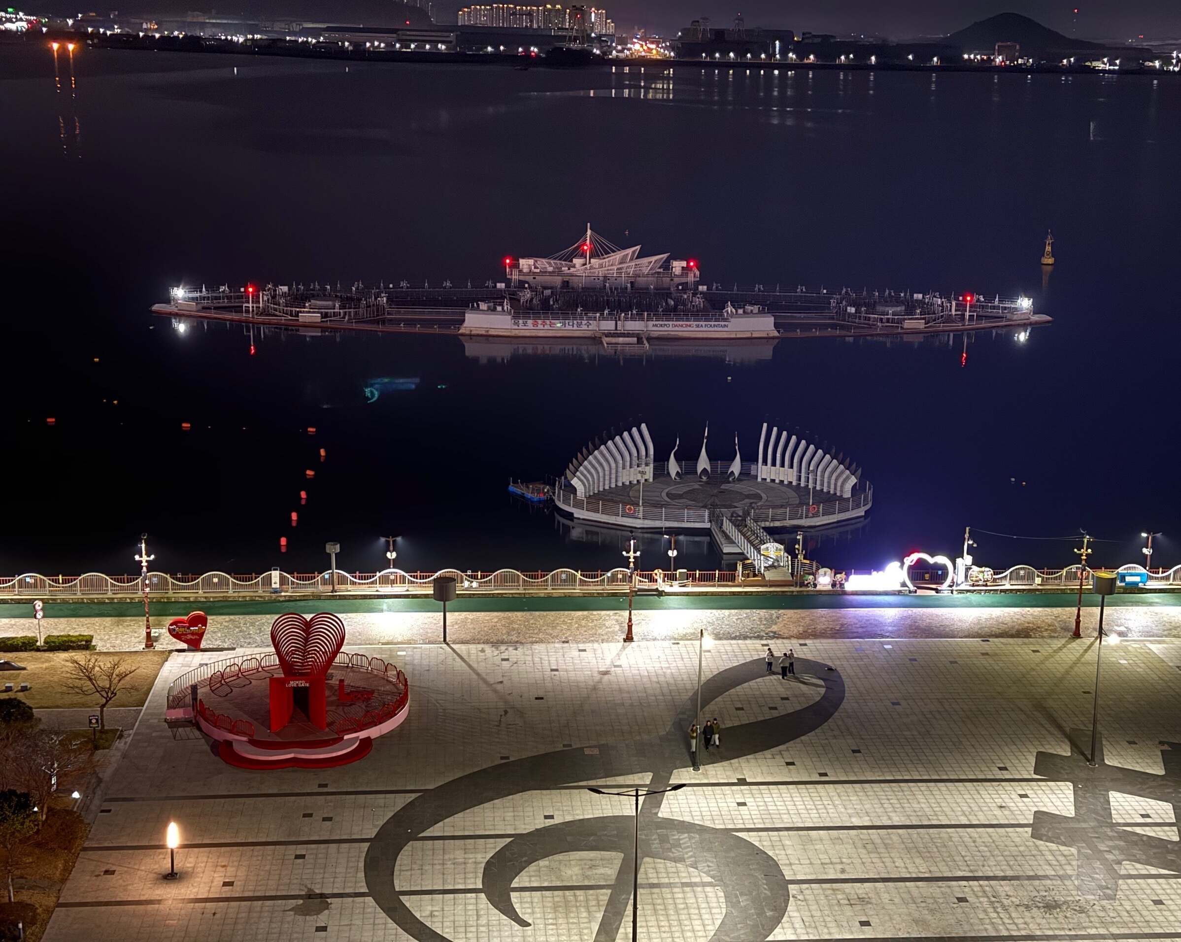 문을 열고 들어가서 버튼을 누르니 자동으로 커튼이 열렸습니다. 자동으로 열리는 커튼 밖으로 펼쳐지는 목포앞바다. 우아~ 감탄사가 절로 나옵니다. 영산강하구둑, 목포춤추는바다분수, 평화광장 등 아기자기 조합으로 이루어내는 서해바다의 멋을 통창을 통해 내려다볼 수있습니다.