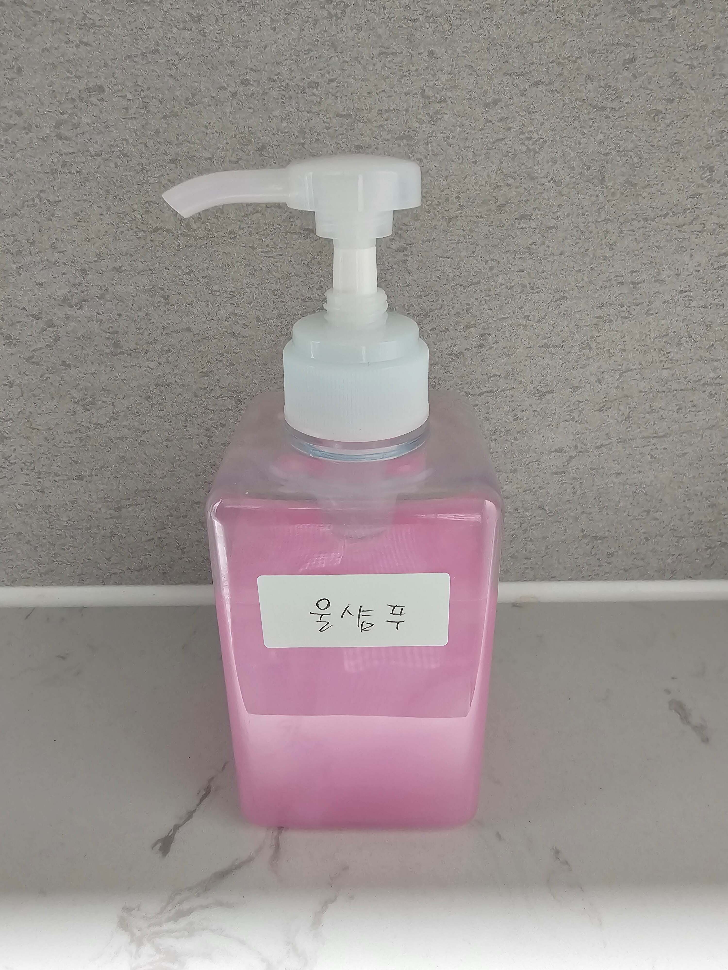 샤워하면서 속옷 등은 간단하게 손세탁하는 경우가 많습니다. 리필통에 울샴푸를 담아 샤워하면서 손빨래를 하면 좋습니다. 투명용기에 라벨지를 붙여 관리하면 됩니다.