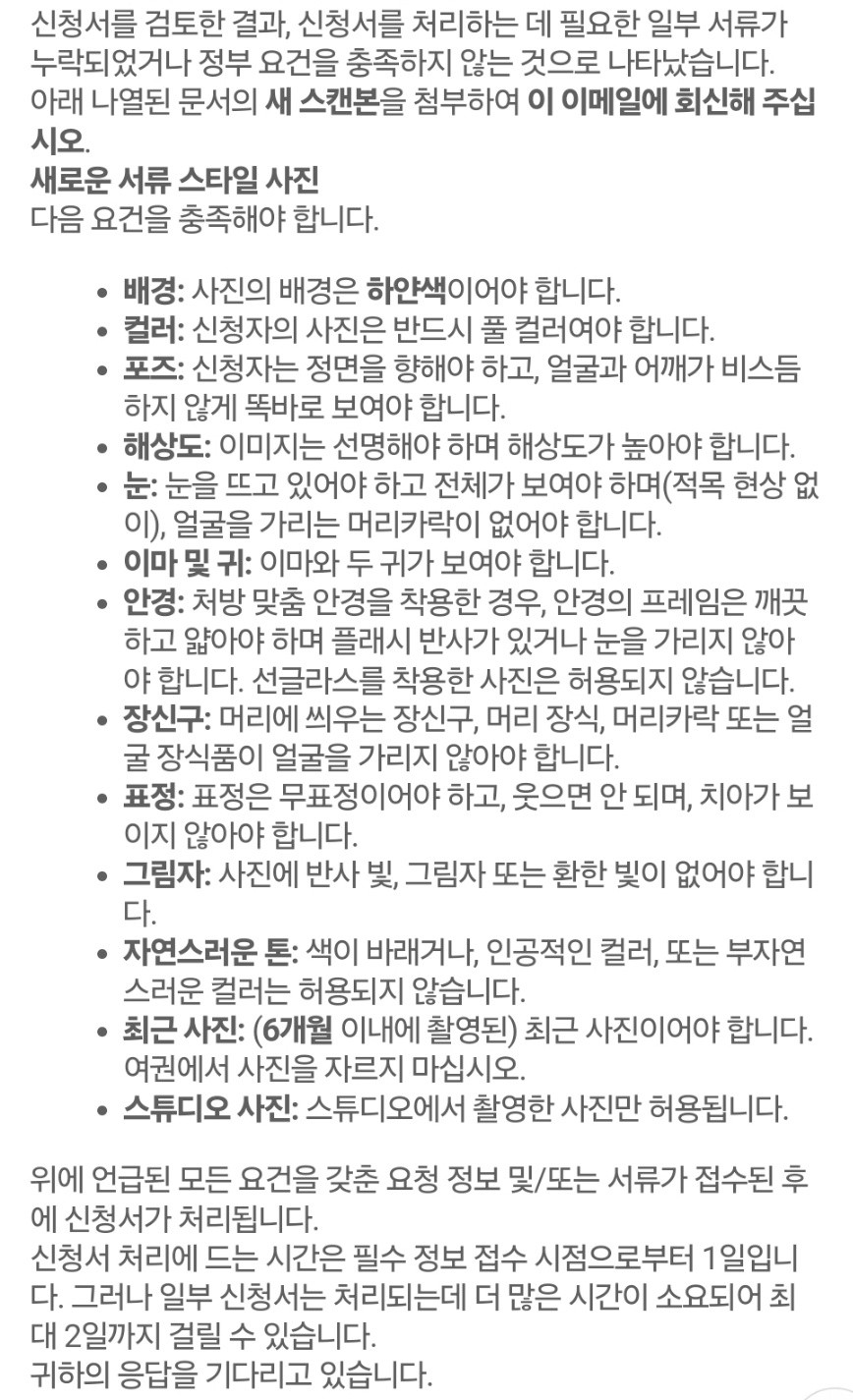 저도 승인 메일만 기다리고 있었는데 사진보완요청 메일이 와서 무척 당황했습니다. 미국여행도 얼마남지 않았고 사진 보완을 하기에는 현생이 너무 바빴기에 걱정이 앞서더라고요!