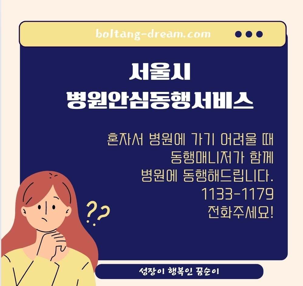 병원위치 찾기 어려움, 수납어려움, 진료실 및 검사실 찾기 어려움 등으로 병원에 혼자가기 어려운 1인가구나 부모님을 직접 병원까지 동행해야하는데 시간이 나지 않는 바쁜 자녀분들이라면 서울시병원안심동행서비스를 신청하여 동행매니저의 도움을 받길 바랍니다.