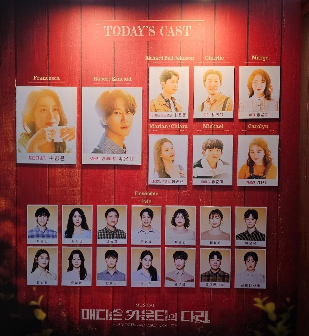 제가 본 시간대에 캐스팅은 로버트 킨케이드 역에 박은태 배우, 프란체스카 역에 조정은 배우였습니다. 놀라운 가창력 속에 빛나는 연기력. 정말 대단하다는 생각밖에 들지 않았습니다.