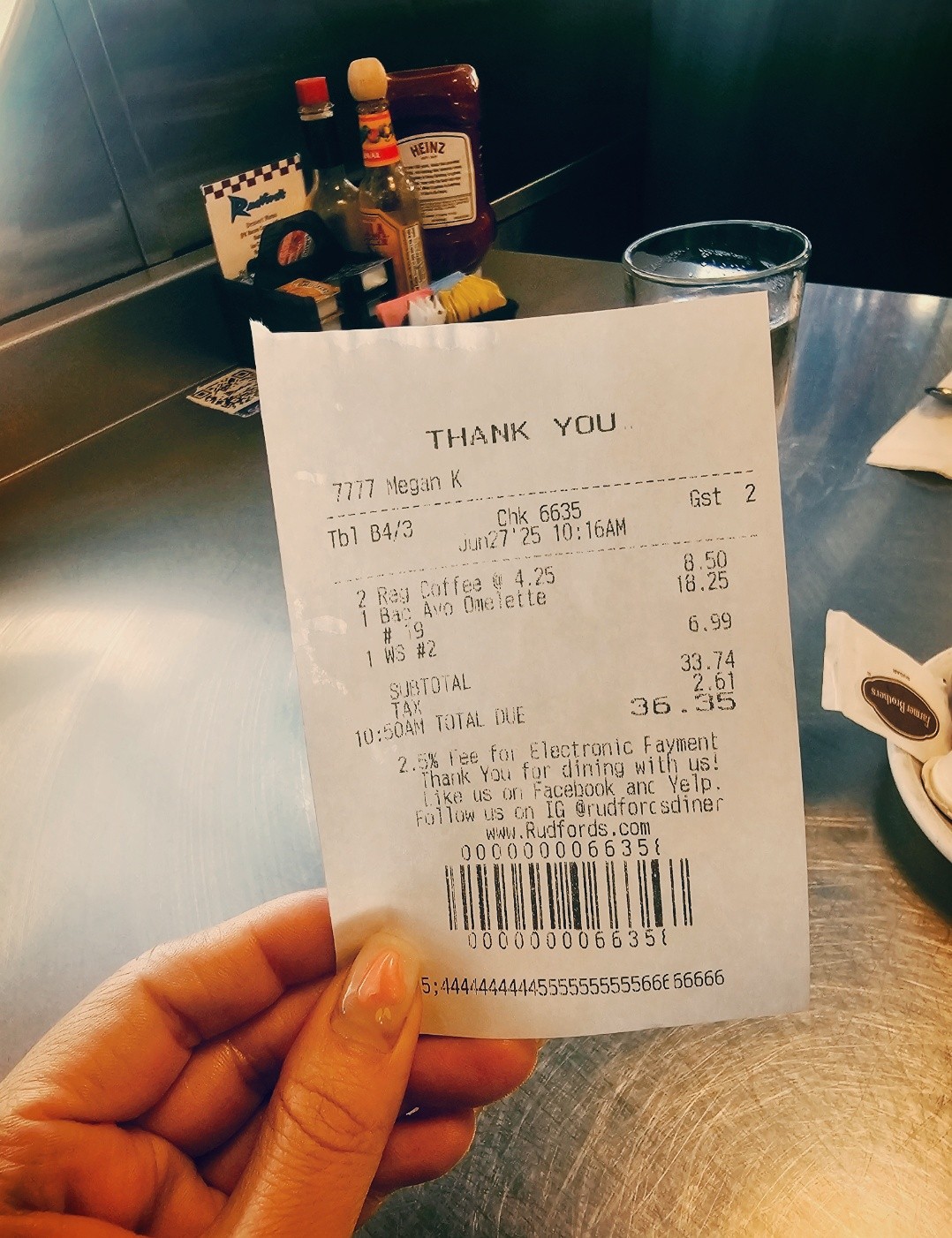 둘이 방문하였고 커피 두잔 추가까지 해서 36.35달러 지불하였습니다.