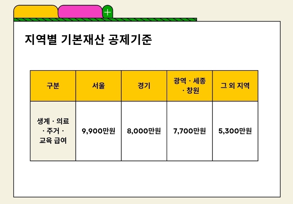 그렇다면 지역별 기본재산 공제 기준과 기본재산에 대해 알려드리겠습니다. 기본재산은 주거용재산, 일반재산, 금융재산으로 이 지역에서 살아가는데 이 정도 재산은 있어야 산다고 보고 지역별로 기준이 있습니다. 기본재산은 지역별기준에 따라 공제를 해주게 됩니다. 지역별로 집값등도 다르고 생활수준이 달라 기본재산 기준이 다릅다. 지역별 기본재산 공제 기준은 아래표와 같습니다.