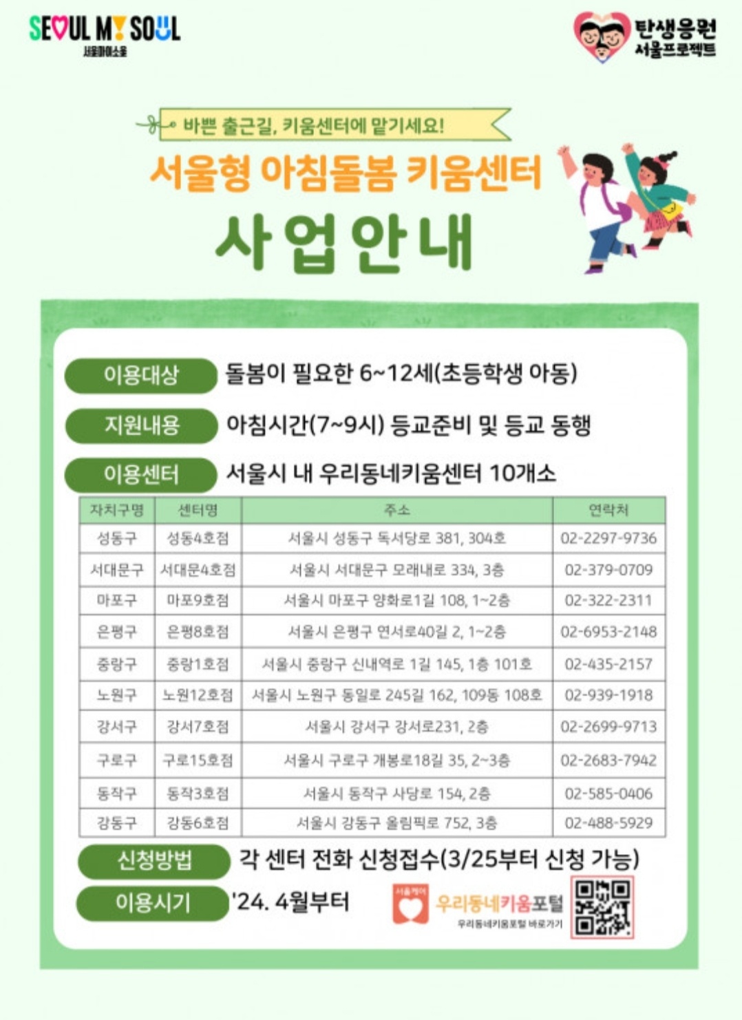 - 4월 1일부터 출근 시간대 돌봄 공백이 발생하는 초등 자녀 가정을 돕는 '아침돌봄 키움센터'를 운영합니다. '서울형 아침돌봄 키움센터'는 돌봄교사의 도움을 통해 부모의 맞벌이 등으로 아침돌봄이 필요한 6~12세 초등학생의 등교 준비와 안전한 등굣길을 지원합니다. 이는 기존 방과 후 시간에 지원하는 돌봄 서비스를 아침까지 확대해 아침과 저녁으로 돌봄 서비스를 지원하여 아이를 낳고 키우기 좋은 환경을 만들기 이해 앞장설 예정입니다.