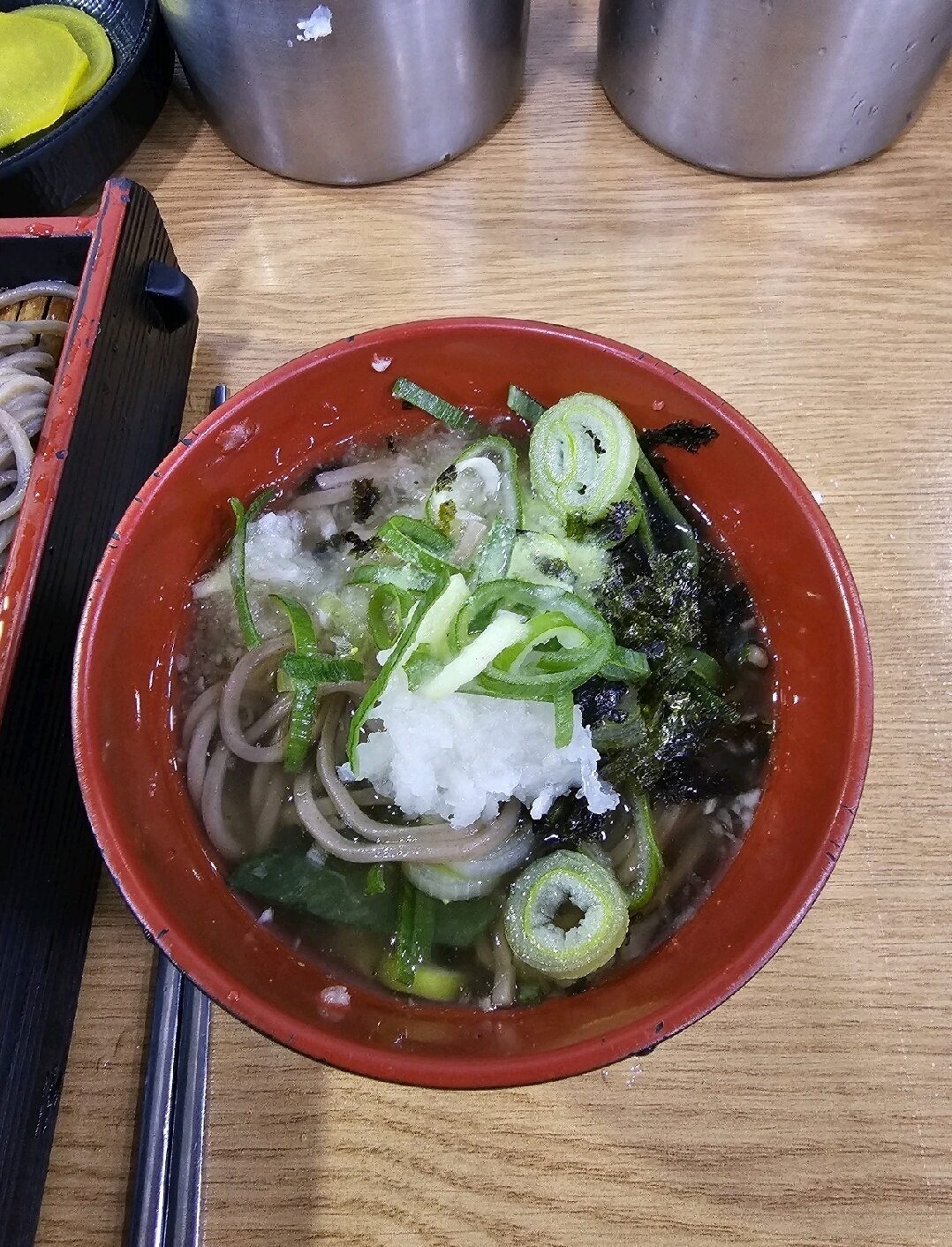 테이블 위에는 언제든지 추가해먹을 수 있는 시원한 장국, 갈은무, 파, 와사비가 있습니다. 시원한 육수에 시원한 갈은무, 파를 듬뿍 넣어 먹으면 시원함이 배가 됩니다. 여기에 함께 나오는 열무 김치는 새콤 시원하여 판메밀 맛을 더 업그레이드 시켜줍니다. 새콤 달짝한 열무 김치가 맛있어 자꾸만 리필하게 됩니다. 여름철 입맛없을 때 판메밀과 열무김치 함께 드시면 입맛을 돌게 만들어 줄 것입니다.