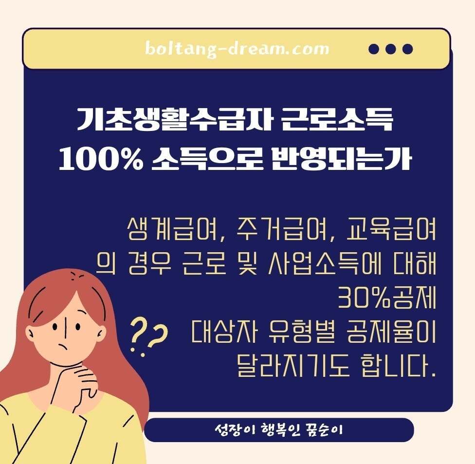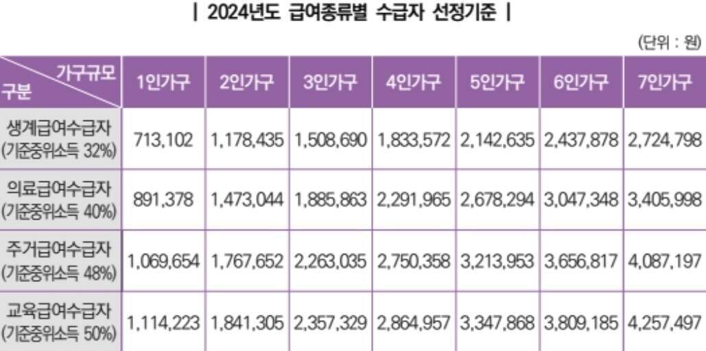 만약 자동차가 없거나 기본재산이 적은 경우 근로소득만으로 생계를 유지해야 하는데요. 이때 소득에 대해 공제되는 것이 있고 장애인, 임산부 등에 대상자유형에 따라 공제율이 더 높아지기도 합니다. 따라서 근로·사업소득만으로 생계를 꾸려나가는 가구는 위의 공제되는 부분을 참고하여 2024년 기준표를 본다면 도움이 될 것입니다.