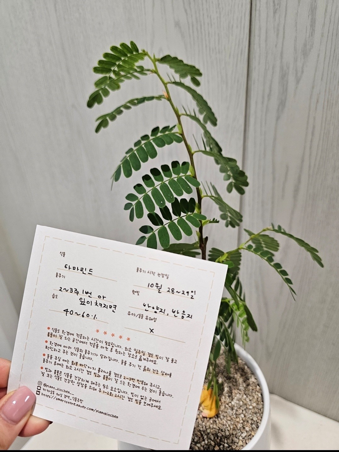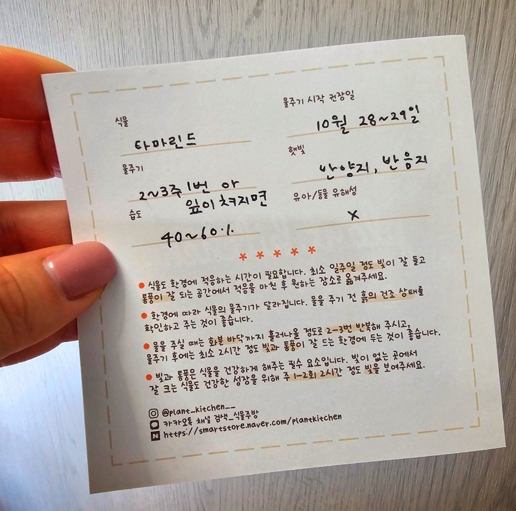 저는 인천 부평구에 있는 '식물주방'이라는 식물가게에서 구입하였고 친절한 사장님의 조언과 카드를 받아 잘 키우고 있습니다. (키울 때 어려움이 있으면 얼마든지 인스타로 문의달라고 하셔서 든든합니다.)