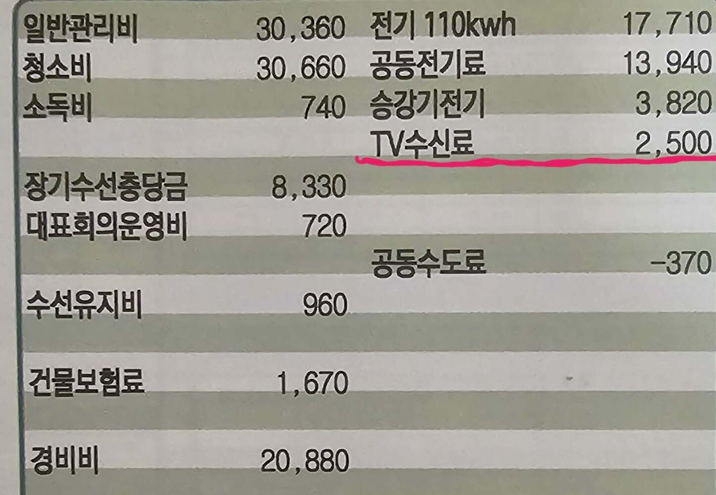 아파트주민일경우 매달 받는 관리비 영수증에 자동으로 TV수신료 2,500원이 부과된 것을 볼 수 있습니다.