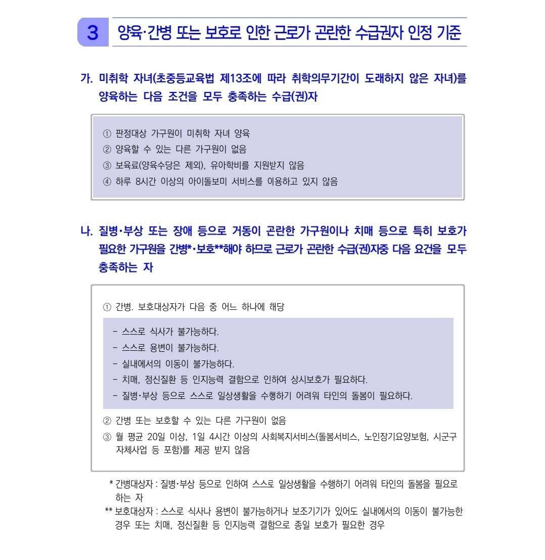 - 타 가구원을 양육·간병 또는 보호해야 하므로 근로가 곤란한 수급권자(가구별 1인에 한함)