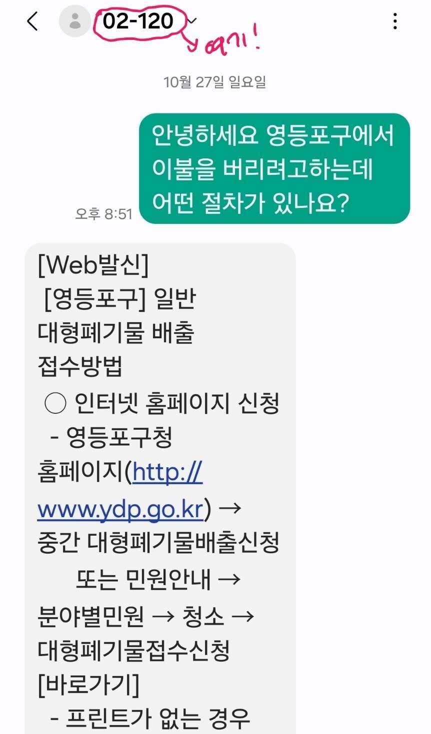 또는 다산콜센터에 02-120 휴대전화 문자 전송을 통해 본인이 거주하는 곳에 이불 배출방법에 대해 문의해보는 방법도 있습니다.