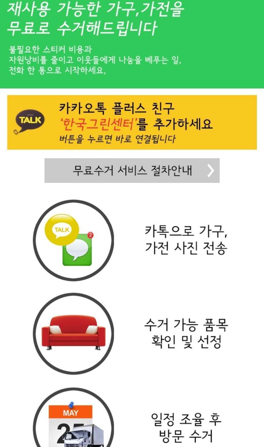 카카오톡 플러스 친구 ' 한국그린센터' 추가 후 무료수거 신청해보시길 바랍니다.