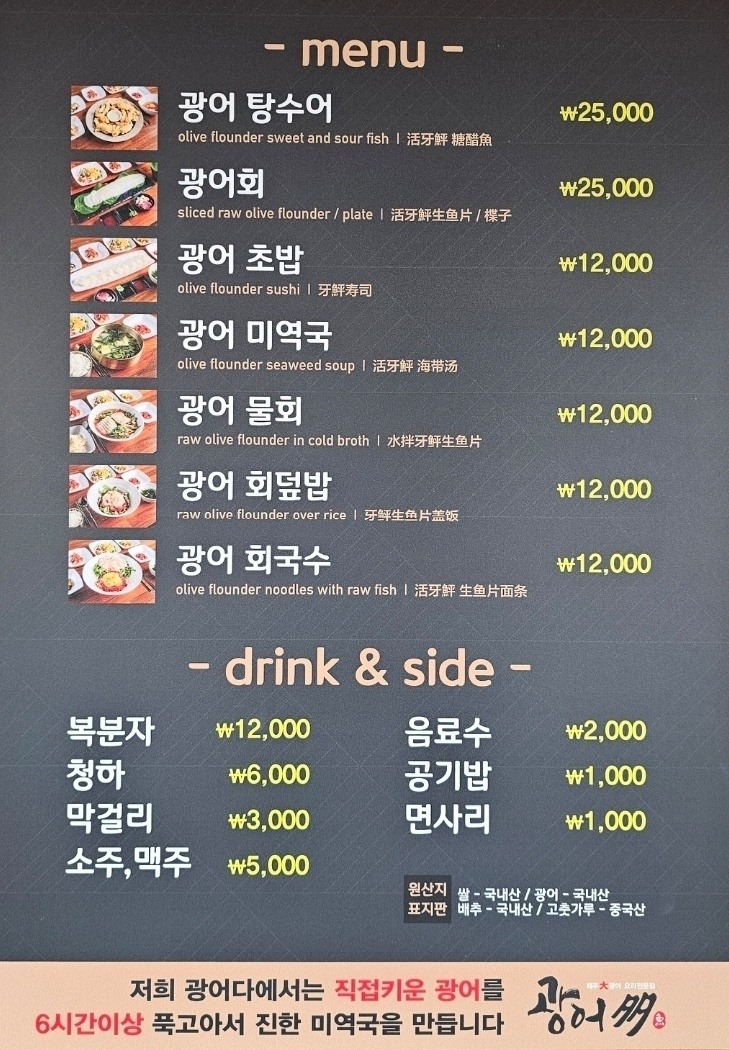 식당 바로 옆에서 초대형 광어양식장을 운영하면서 식당을 하고 있으니 정말 신선할 수밖에 없습니다. '광어다'는 신선한 음식을 제공하기 위해 당일 판매분만 준비해 운영하고 있습니다. 그만큼 신선해 여름철에도 회, 물회, 회덮밥, 회국수 등 사람들이 즐겨찾는 메뉴입니다.