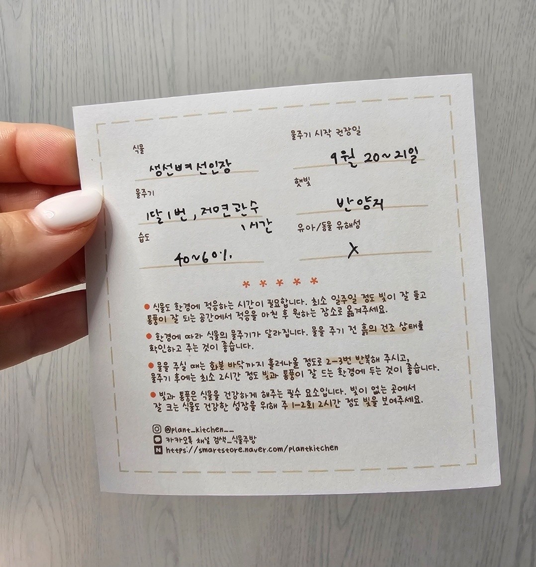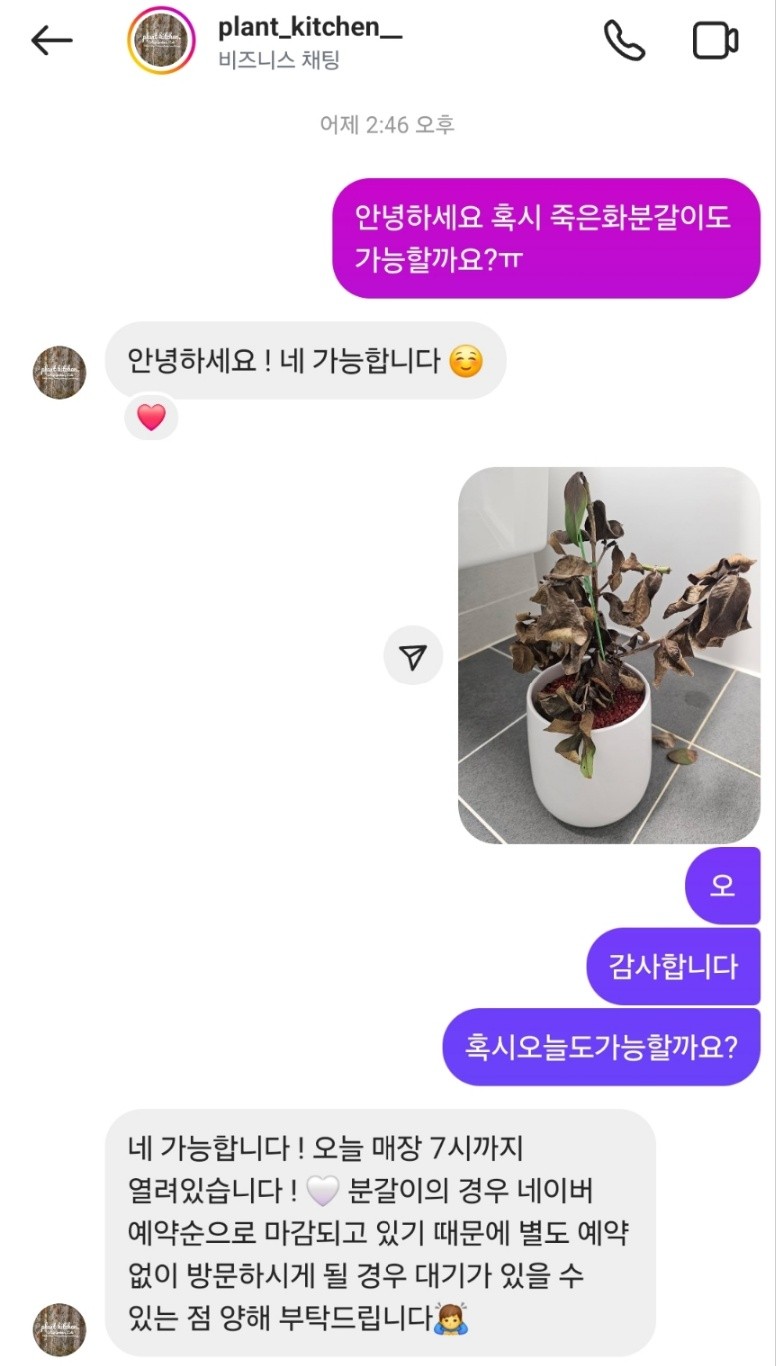 식물 관리 방법까지 친절하게 설명해주셨고 언제든지 어려운 사항이 있으면 인스타그램 디엠으로 문의주라고 하셨어요. 이제 든든한 조력자까지 있으니 식물 죽이지 않고 잘 키울 수 있을 것 같습니다.