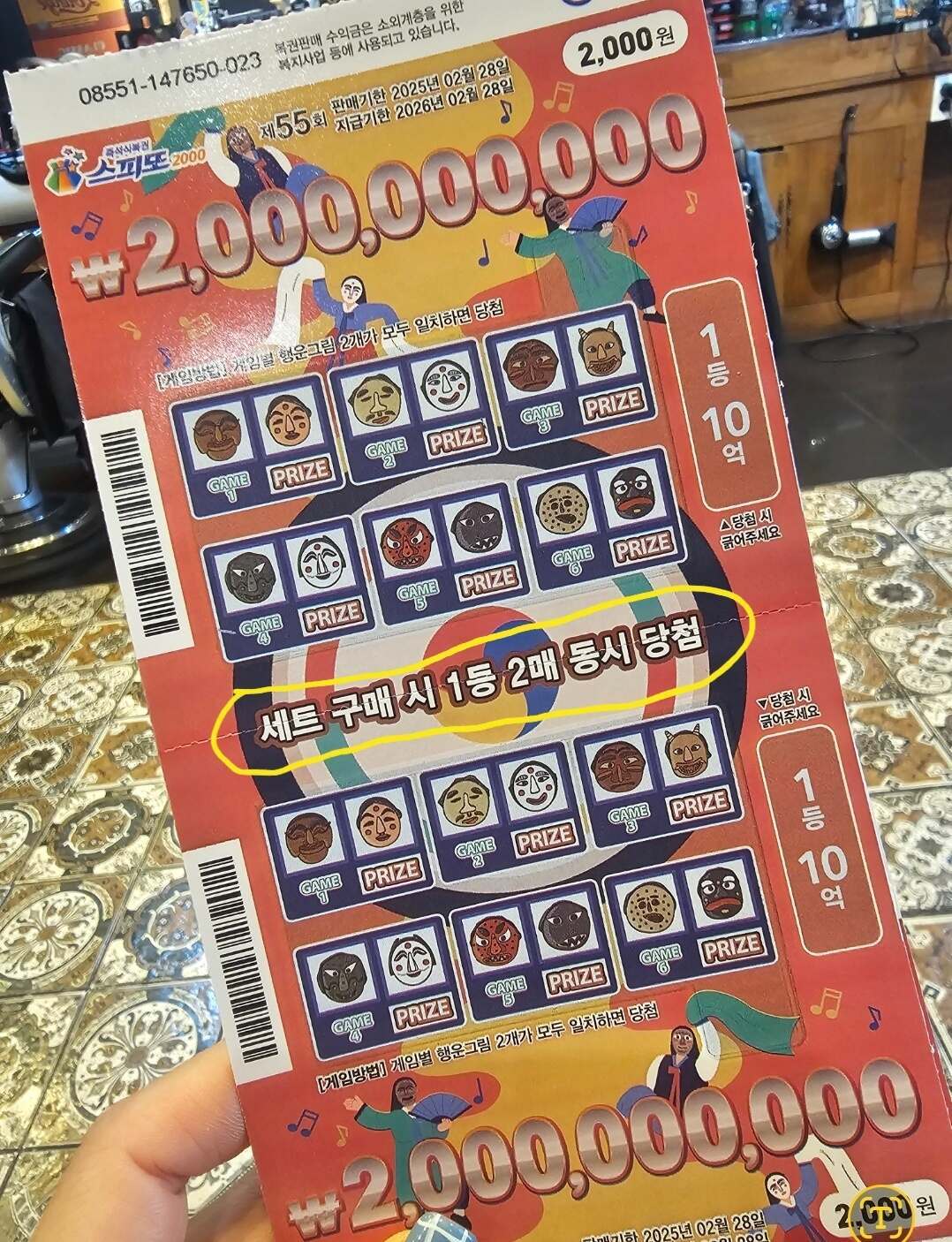 스피또 2000을 구입할 때 다른 복권과 다른 점이 있습니다. 바로 스피또 2000은 다른 복권과 다르게 1등 당첨은 연달아서 발행된다는 점입니다. 예를 들어 스피또 2000을 긁었는데 1등 10억이 당첨됐다고 가정했을 때 이 복권의 앞장 또는 뒷장도 똑같이 1등이라는 이야기입니다. 만약 1장이 1등에 당첨됐다면 연달아 산 스피또복권도 1등일 확률이 높아지게 됩니다. 따라서 스피또 2000의 1등 당첨금을 10억원으로 알고 있지만 1등이 연달아 발행되기때문에 최대 20억까지도 당첨될 수 있다는 것입니다.