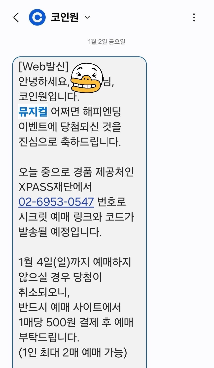 이번에 코인원에서 진행한 컬처 프로젝트에 응모했는데, 정말 운 좋게도 당첨 문자를 받았습니다! 💌 평소 정말 보고 싶었던 뮤지컬 **<어쩌다 해피엔딩>**이라니... 코인원 덕분에 문화생활까지 완벽하게 챙기게 됐네요.
