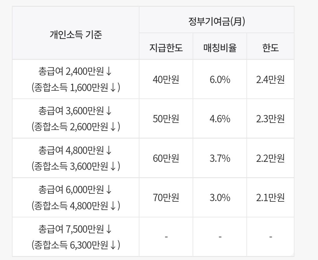 - 매월 최대 6%의 정부기여금을 지급하고 이자소득에 대한 비과세 혜택을 제공합니다. 정부기여금은 60개월 기준 기여금 최대 126만 원~144만 원을 받을 수 있습니다. 이는 소득 요건에 따라 달라집니다.