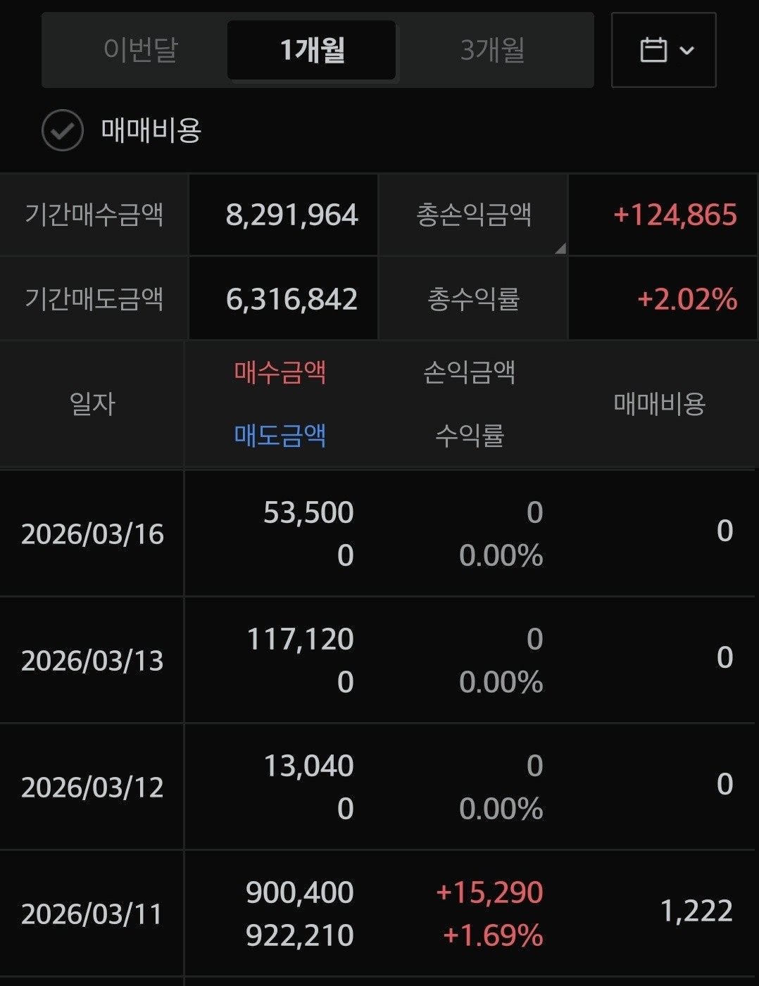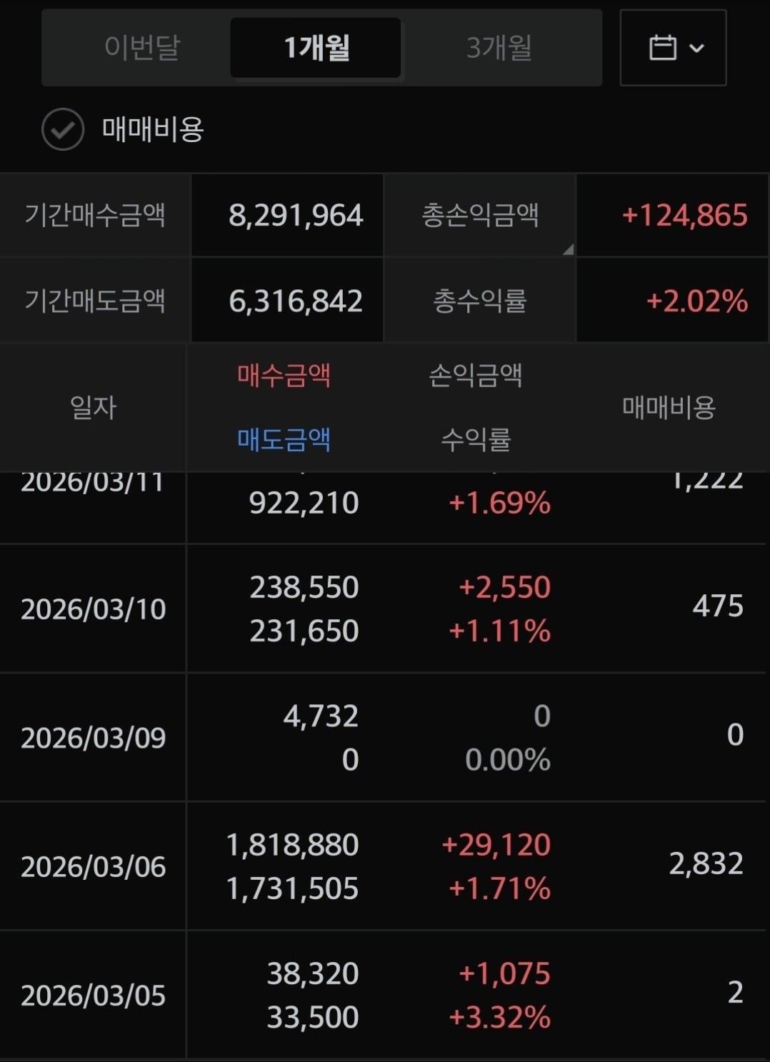 아직 주린이기에 많은 주수를 매수하지는 않고 있어 수익이 크지는 않지만 3월의 악재 속에서도 정말 1% 이상의 수익을 냈습니다. 1% 수익이 목표였기에 3월 한달도 목표 달성(+2.02%)하였습니다. 목표가 낮은 만큼 지난 달 거의 매일 1%의 수익은 가능했지만 이번 3월은 1% 수익마저 힘든 분위기였습니다.
