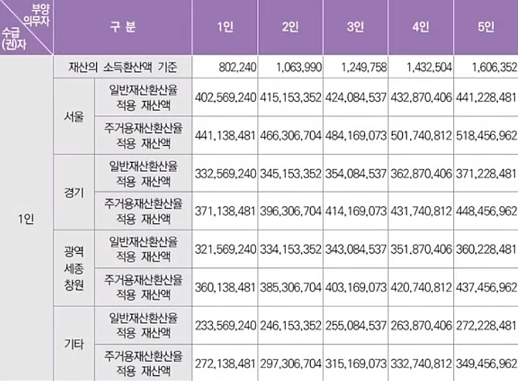 둘째, 부양의무자의 재산기준은 부양의무자가 어느 지역에 사느냐에 따라 기준이 달라집니다. 아래표는 수급(권)자 가구가 1인가구일 때 기준입니다.