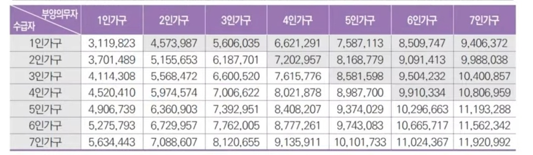 첫째, 부양의무자의 소득기준이 중위소득 100%미만에 해당하여야 합니다.