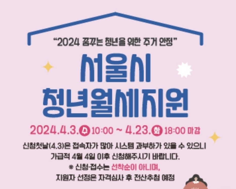 - 2024.04.03 수 오전 10시 ~ 04.23 화요일 오후 6시까지 서울주거포털(https://housing.seoul.go.kr)에서 온라인으로만 신청을 받습니다. 방문 및 우편 접수 불가합니다.