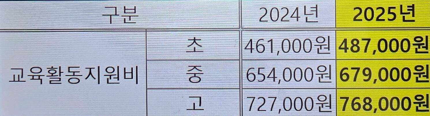 교육급여는 교육활동지원비를 2024년 대비 5% 인상하였습니다.
