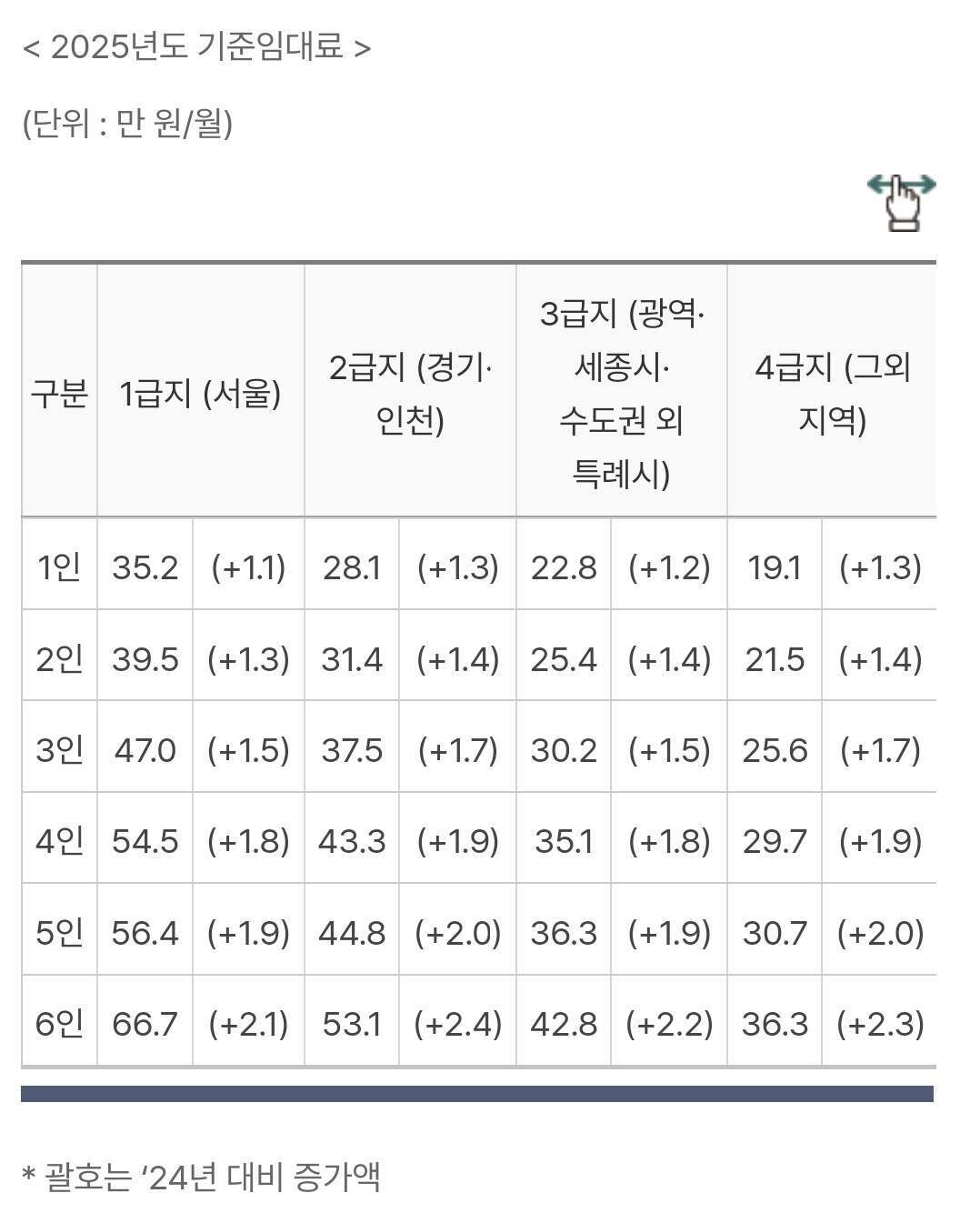 주거급여는 임차가구의 기준임대료를 2024년 대비 급지·가구원수별 1.1~2.4만 원 인상하고 자가가구의 주택 수선비용을 2024년 대비 133~360만 원 인상되었습니다.