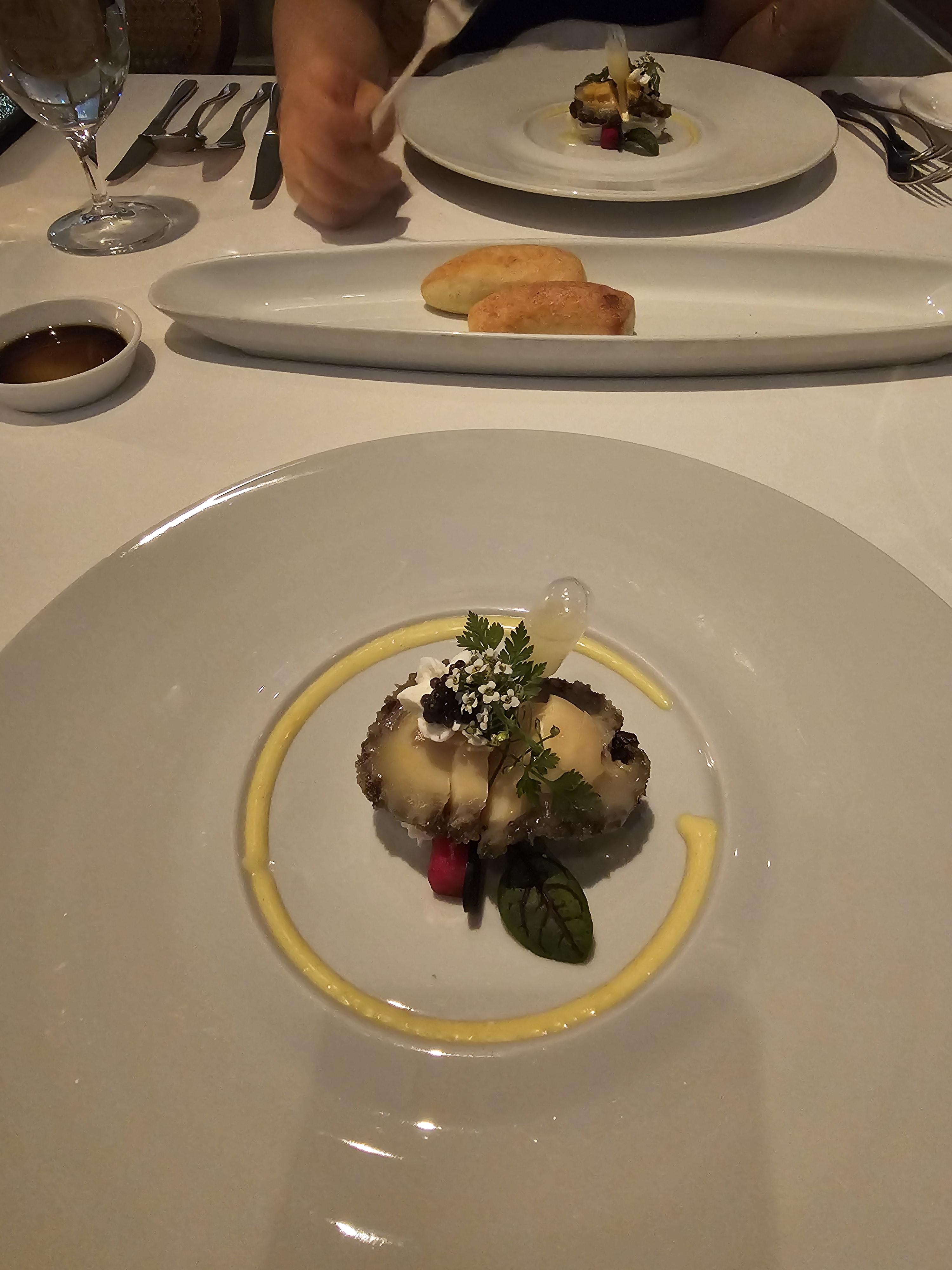 다음으로 '리코타 치즈와 유자 드레싱을 곁들인 전복 샐러드'가 나왔고 리코다 치즈 양도 많고 무척 꾸덕하고 진하여 전복와 찍어먹는 맛이 저세상 맛이었습니다.