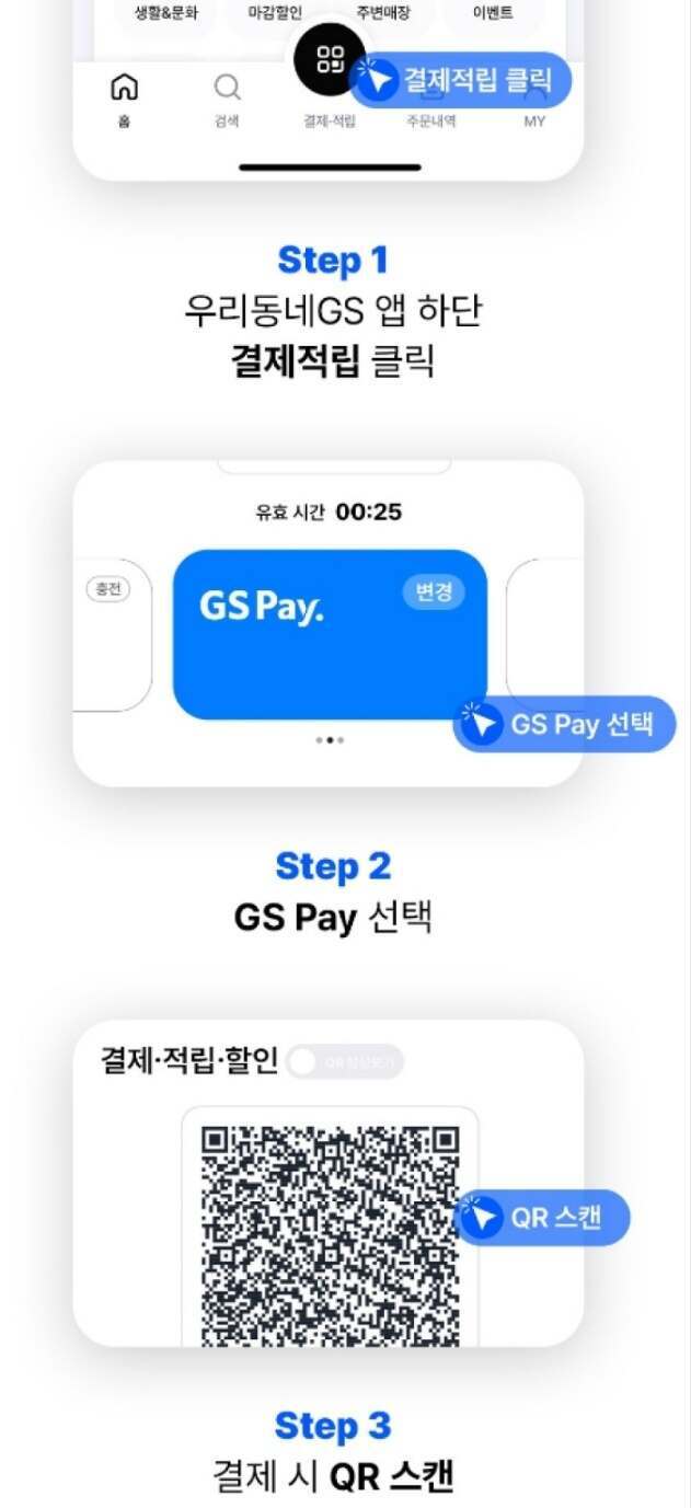 우리동네GS앱을 실행하시고 하단 중앙 결제ㆍ적립을 클릭하면 QR코드가 나옵니다. QR코드를 GS편의점 직원에게 보여주시면 됩니다.