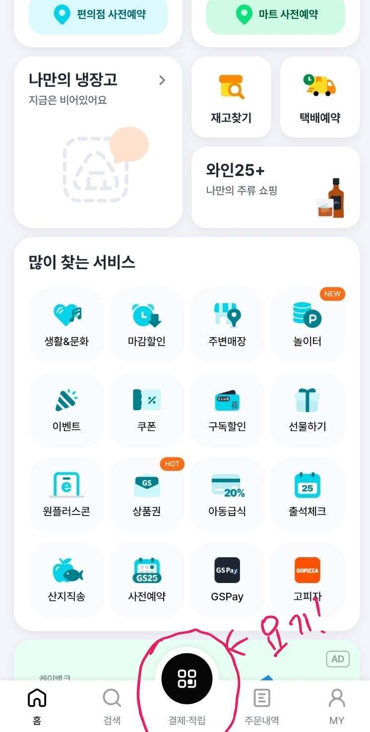 2. 중앙 하단에 있는 결제·적립을 눌러줍니다.