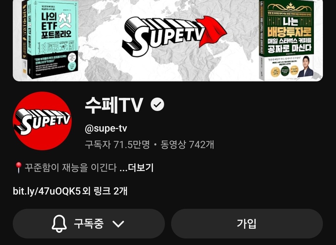 송민섭님의 수페TV를 구독하고 꾸준히 영상을 보고있습니다. 구독자가 10만이 넘지 않을 때부터 구독하고 보았는데 벌써 71.5만명의 구독자가 있는 수페님이십니다. ETF(상장지수펀드), 미국 주식, 국내외 주식시장 분석, 배당 전략 등 투자/재테크 관련 콘텐츠를 엄청난 분석력으로 매주 업로드해주는 소중하고 유용한 영상입니다. 저도 수페님과 함께 30년간 매주 S&P500 1주 매수하는 챌린지에 동참하고 있습니다.